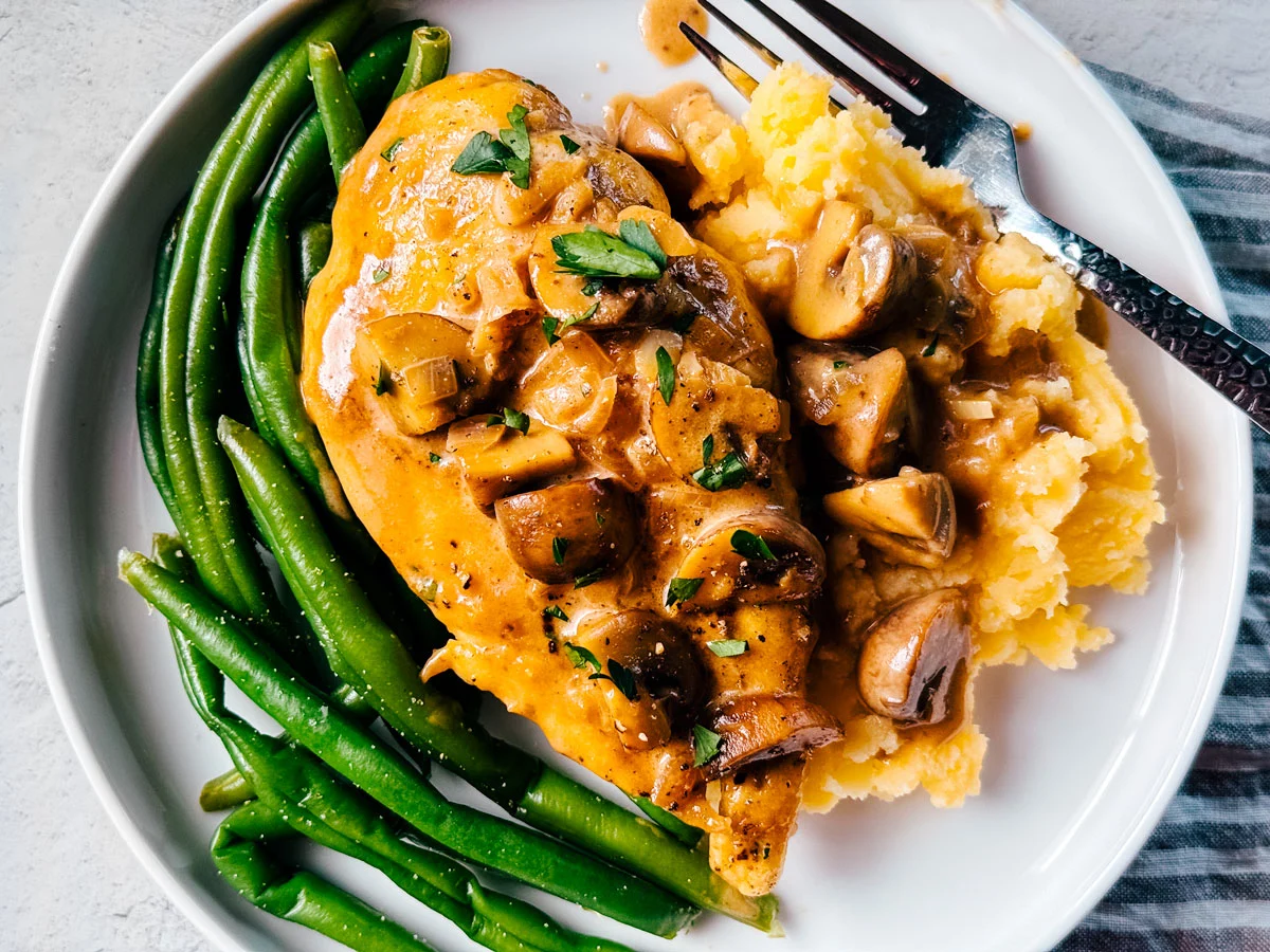CHEESY CHICKEN MARSALA WITH CAULIMASH AND GREEN BEANS