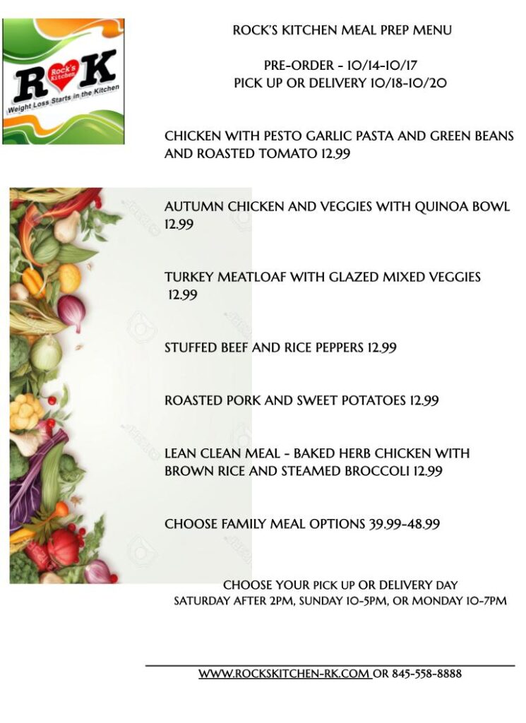 Rock's Kitchen >> Meal Prep >> PRE–ORDER TUESDAY 10/14 THROUGH FRIDAY 10/17 AT 7 PM, AVAILABLE FOR PICK-UP SAT 10/18 after 2 PM, SUN 10/19 10 AM -5PM OR MON 10/20 10 AM—7 PM.