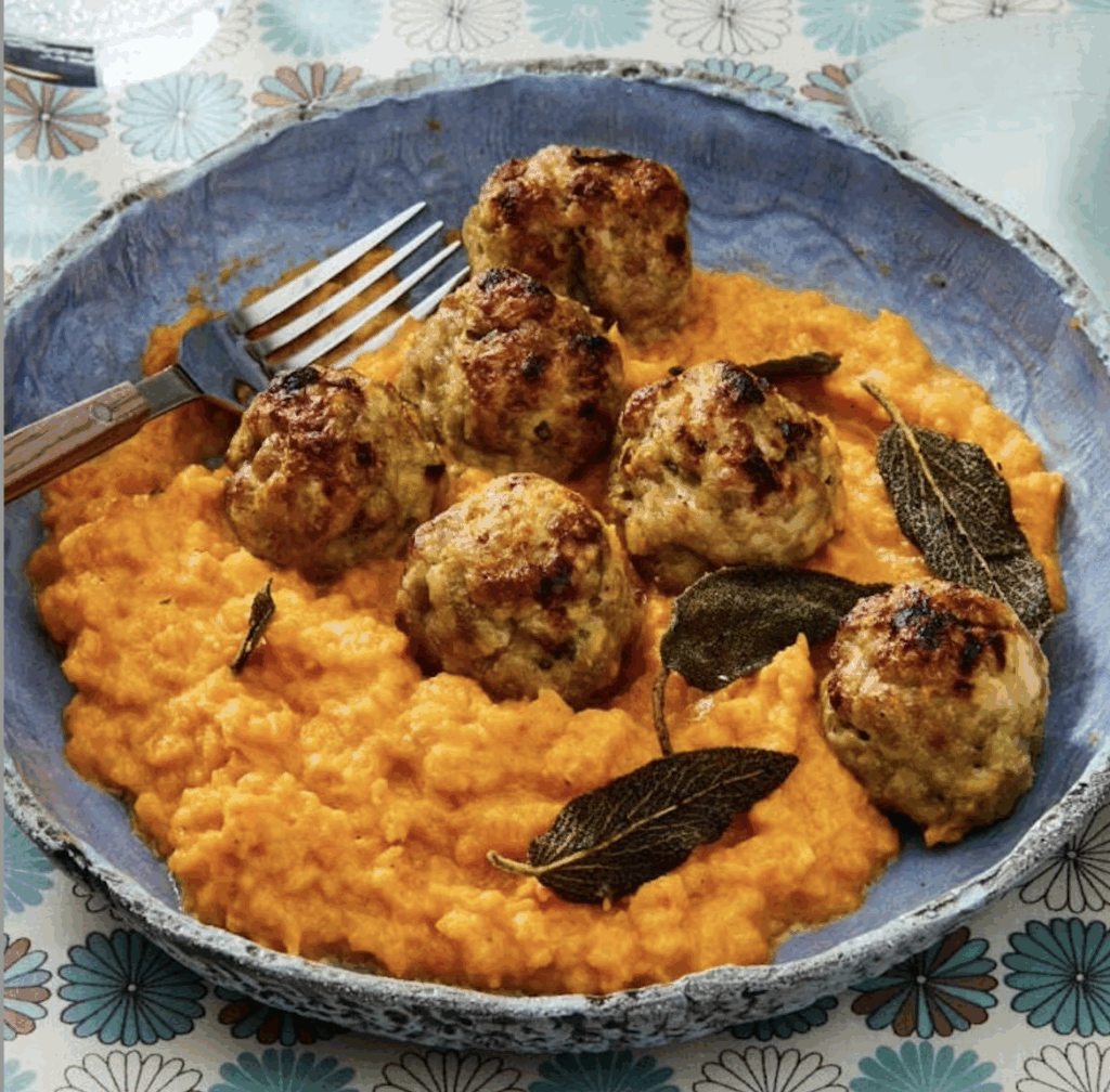PORK, APPLE, AND SAGE MEATBALLS OVER SWEET POTATO PUREE