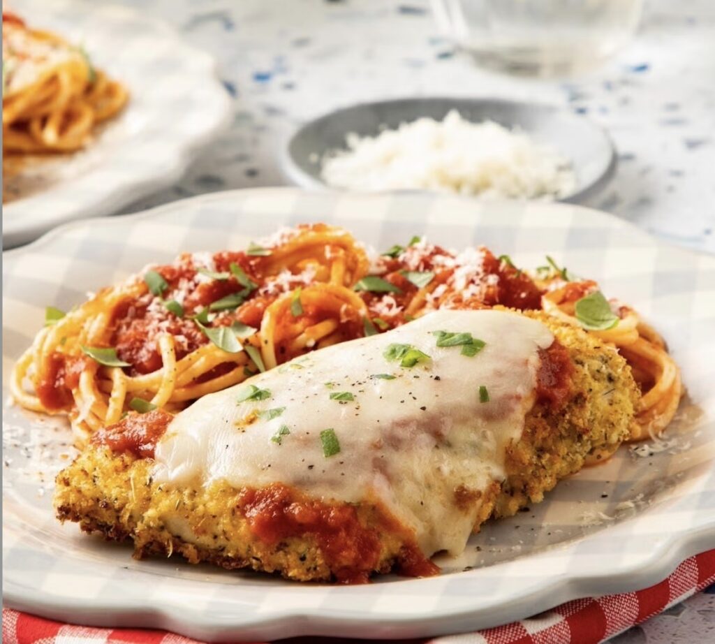 CHICKEN PARMESAN OVER PASTA WITH GREEN BEANS