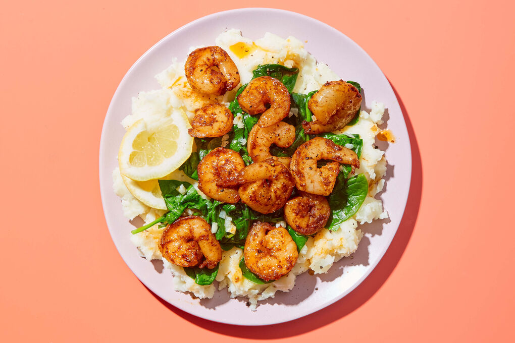 LEMON SHRIMP WITH CAULIMASH & GARLICKY SPINACH