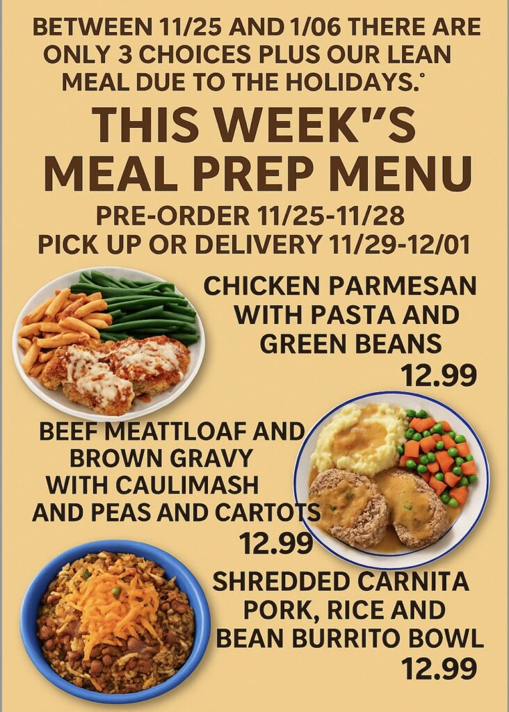 WEEK OF 10/05 MEAL PREP MENU AVAILABLE FOR PICKUP OR DELIVERY 10/09-10/11