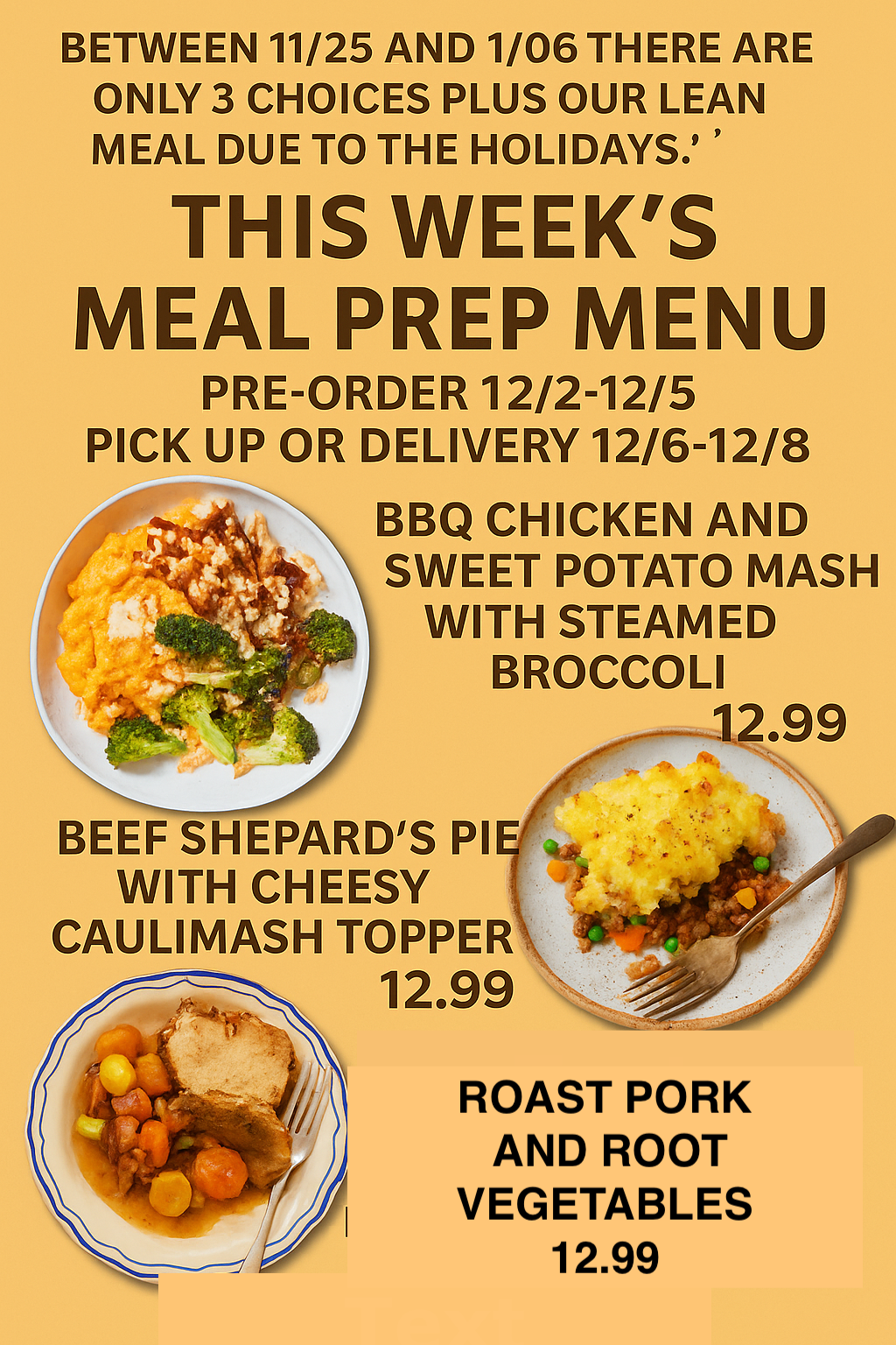 PRE–ORDER TUESDAY 12/02 THROUGH FRIDAY 12/05 AT 7 PM, AVAILABLE FOR PICK-UP SAT 12/06 after 2 PM, SUN 12/07 10 AM -5PM OR MON 12/08 10 AM—7 PM.