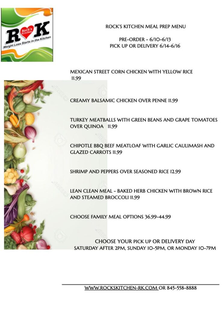 Rock's Kitchen >> Meal Prep >> PRE–ORDER TUESDAY 6/10 THROUGH FRIDAY 6/13 AT 7 PM, AVAILABLE FOR PICK-UP SAT 6/14 after 2 PM, SUN 6/15 10 AM -5PM OR MON 6/16 10 AM—7 PM.