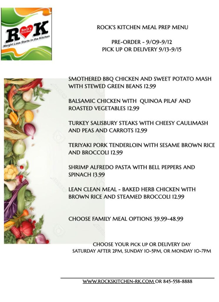 Rock's Kitchen >> Meal Prep >> PRE–ORDER TUESDAY 9/09 THROUGH FRIDAY 9/12 AT 7 PM, AVAILABLE FOR PICK-UP SAT 9/13 after 2 PM, SUN 9/14 10 AM -5PM OR MON 9/15 10 AM—7 PM.
