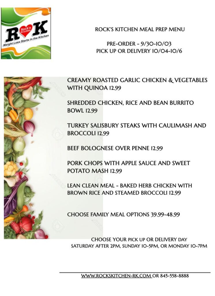 Rock's Kitchen >> Meal Prep >> PRE–ORDER TUESDAY 9/30 THROUGH FRIDAY 10/03 AT 7 PM, AVAILABLE FOR PICK-UP SAT 10/04 after 2 PM, SUN 10/05 10 AM -5PM OR MON 10/06 10 AM—7 PM.