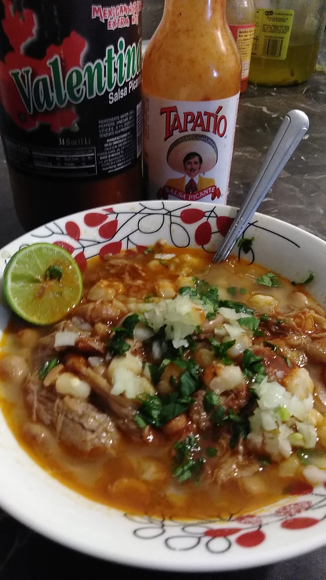 Maria De Carmen Romero's Nana's Mexican Red Chile Posole top with chopped green cilantro & white…