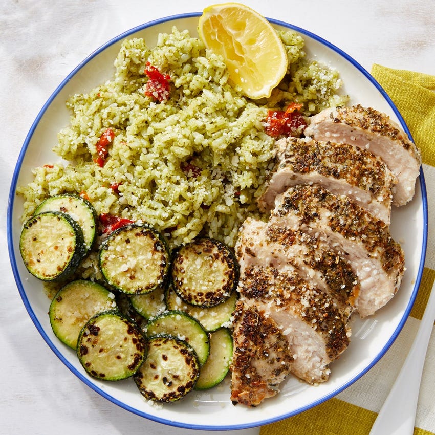 ITALIAN-STYLE CHICKEN & ZUCCHINI WITH PESTO-PEPPER QUINOA  – THIS SIMPLE DISH IS PACKED WITH VIBRANT ITALIAN FLAVORS LIKE BASIL, AS WELL AS A BLEND OF CLASSIC SEASONINGS LIKE THE FRAGRANT DRIED ROSEMARY AND SAGE USED TO COAT OUR CHICKEN. SERVED WITH A PESTO AND ROASTED PEPPER QUINOA AND BAKED PARMESAN ZUCCHINI  11.99